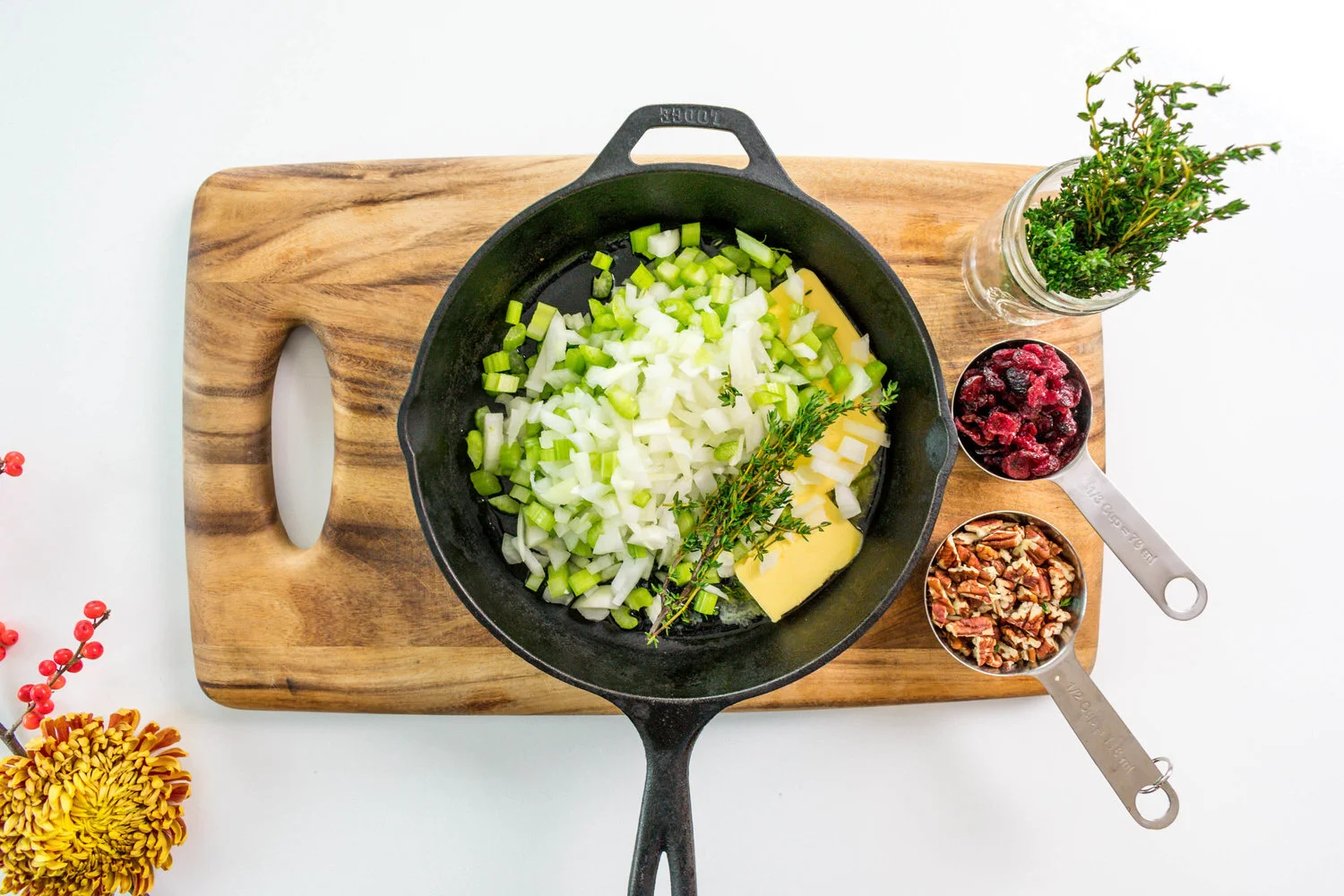 Once the wild rice is done cooking, add to the skillet and stir to combine. Add chopped pecans, dried cranberries and stir. Salt and pepper to taste.