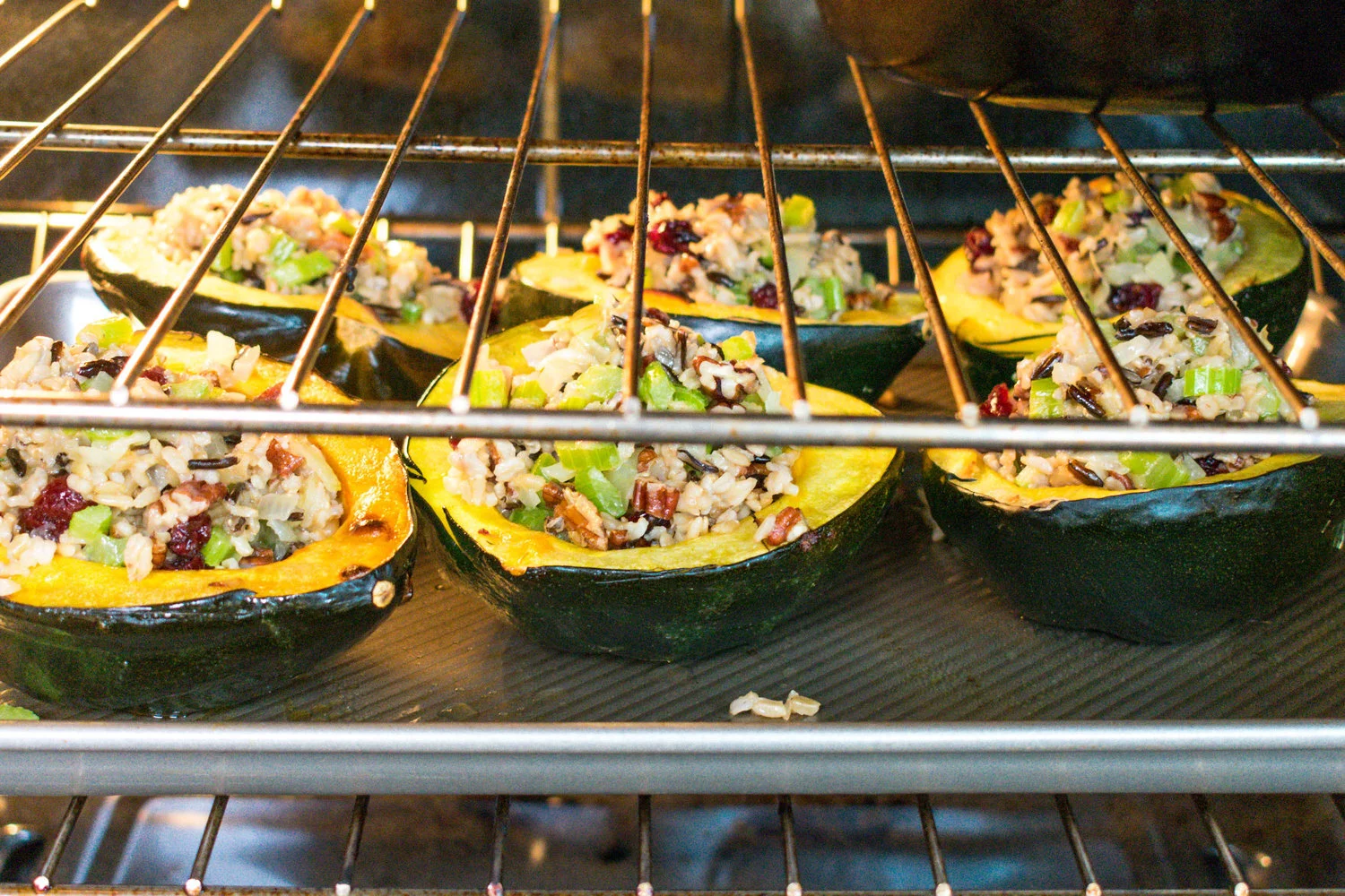 Stuff each acorn squash with about 1 cup of stuffing mixture, packing stuffing into squash cavity and mounding it slightly. Drizzle each squash with a bit more olive oil and bake until squash is tender and stuffing browns slightly, about 20 more minutes.