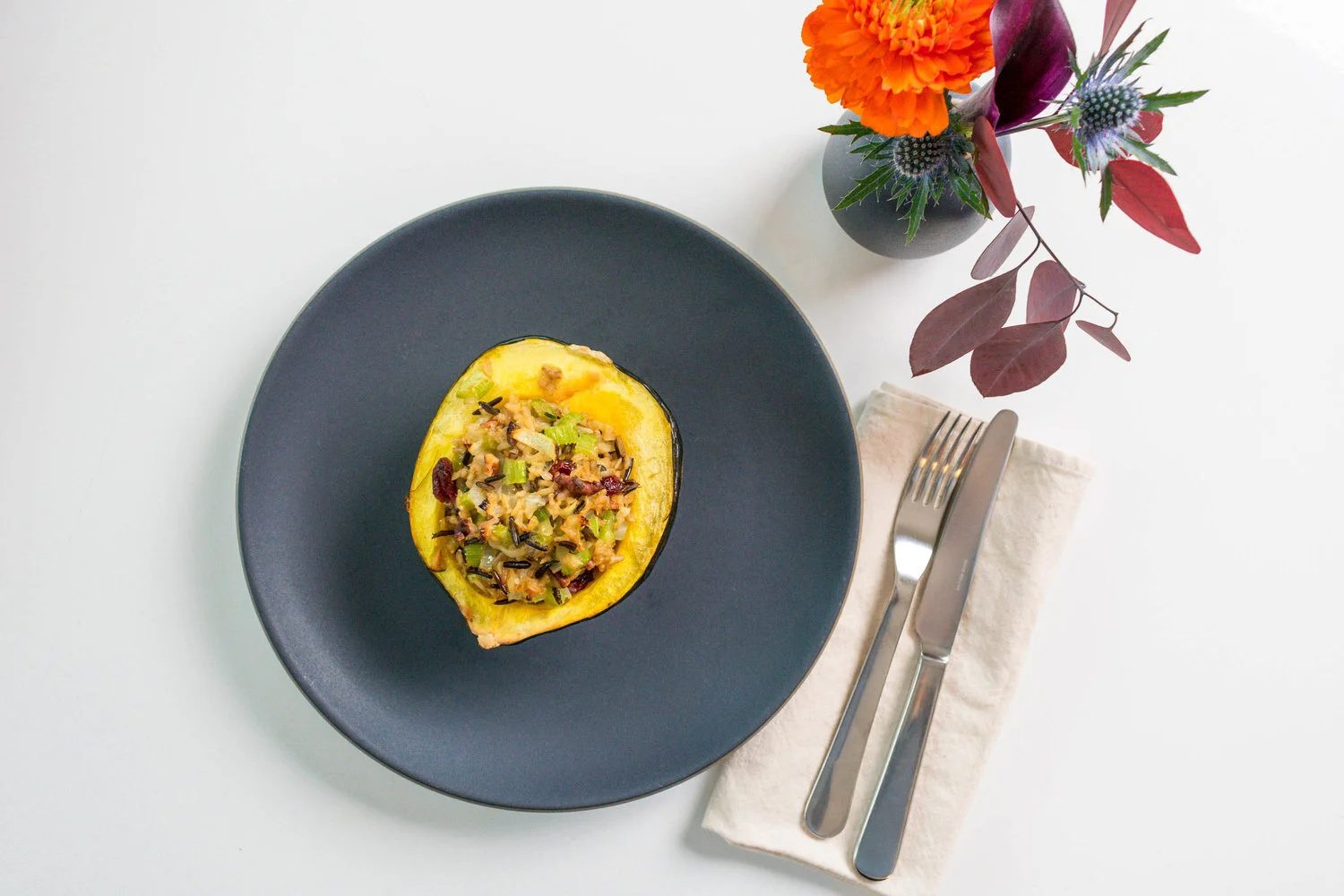 Roasted acorn squash is one of my favorite things about fall and this vegan dish works as a hearty side or can star as the main event.